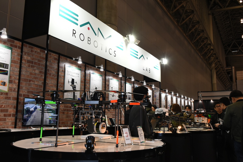 DJIと並んで大きな展示ブースを構えていたのが「EAMS LAB(イームズラボ)」と「EAMS ROBOTICS(イームズロボティクス)」。同社はこれまで日本のドローン開発の一翼を担ってきたメーカー「エンルート」の流れを汲む「エンルートラボ」が3月初旬、親会社である「エンルートM’s(エンルートエムズ)」を引受先とする第三者割当増資を行い、商号変更を行う形で生まれ変わった会社である。同時に親会社のエンルートM’sはイームズロボティクスと改称し、EAMSグループとしてドローンとロボットの開発を行っていくという。