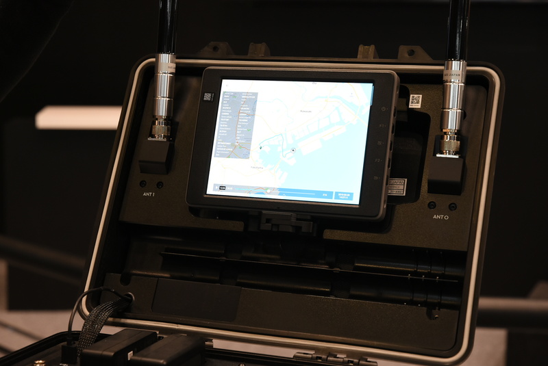 DJIの「AeroScopeレシーバー」。周辺を飛行するDJI製ドローンからコントローラーに向けて送信される電波を受信し、その登録番号やその位置をモニター上に表示する。