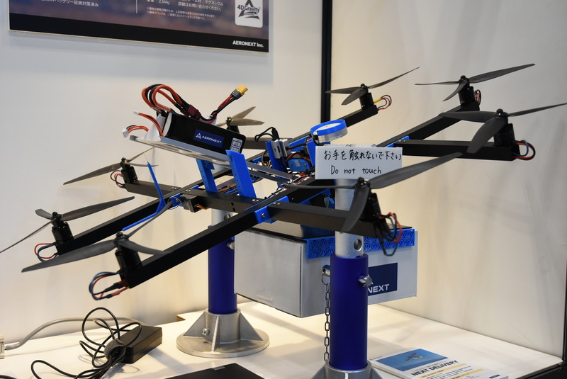 マクセル製インテリジェントバッテリーを搭載した、数々の日本製ドローンを集めた同社のブース。“発煙・発火0”を標榜するなど、安全性を強く訴求していた。