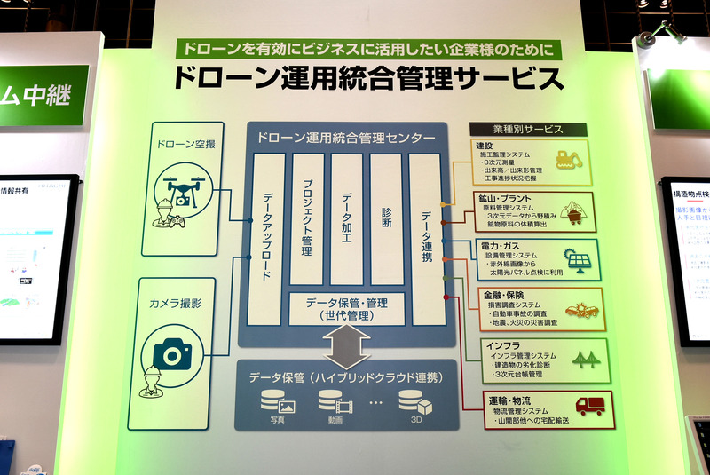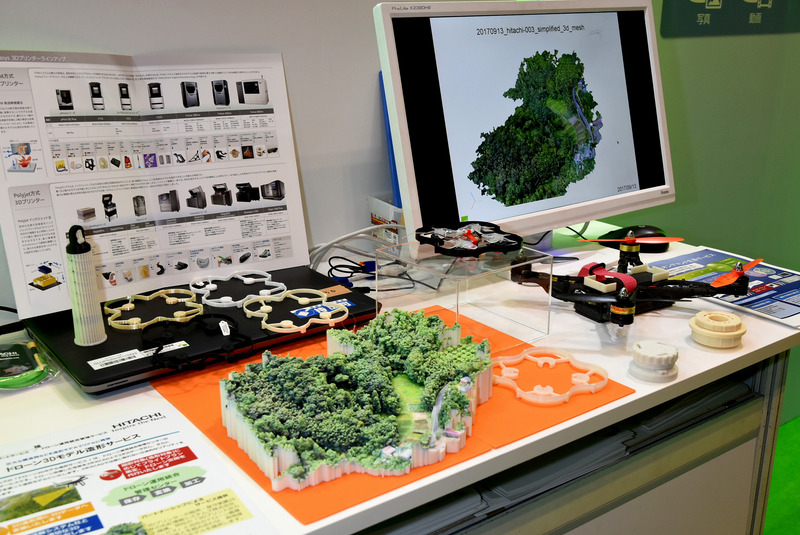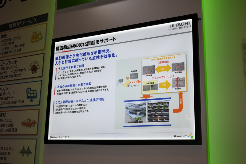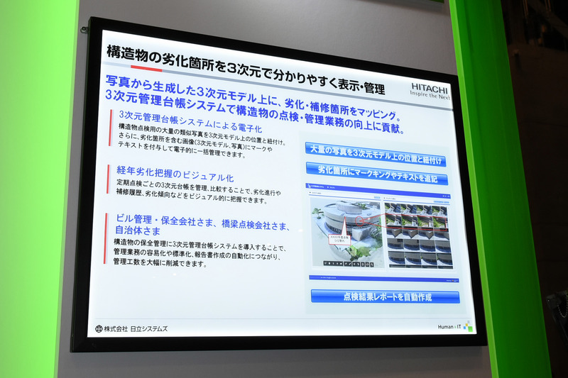 日立システムズはこれまで培ってきたシステム開発のノウハウを生かし、ロボティクスサポートサービスのひとつとして、空撮画像を顧客のビジネスに合わせて最大限活用するための「ドローン運用統合管理サービス」を出展。データの管理、加工、診断など、同社が用意するさまざまなサービスの中から、必要なサービスを組み合わせて利用できるという。データの「3次元管理台帳」やそこにある画像からAIが構造物の劣化を発見する「劣化診断」、さらには現場と事務所で映像を転送する「リアルタイム中継」といったサービスを展示。さらに3次元データからリアルな縮小モデルを作る「ドローン3Dモデル造形サービス」も参考出展として展示していた。
