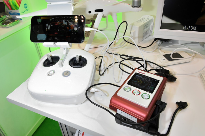 展示の中心は「ドローン用インテリジェントリチウムイオン電池パック」だが、実はこの製品は昨年のJapan Droneでも出展していた。その後1年を経て、今年はこのバッテリーを搭載する多くのドローンを一堂に展示。産業用の大型機ではまだまだラミネート型セルをフィルムでパックしたものが多い中、過充電保護、充電過電流、温度保護機能などインテリジェント化したこのバッテリーの採用を推進してきた成果だ。