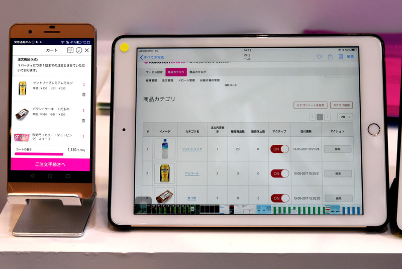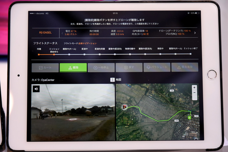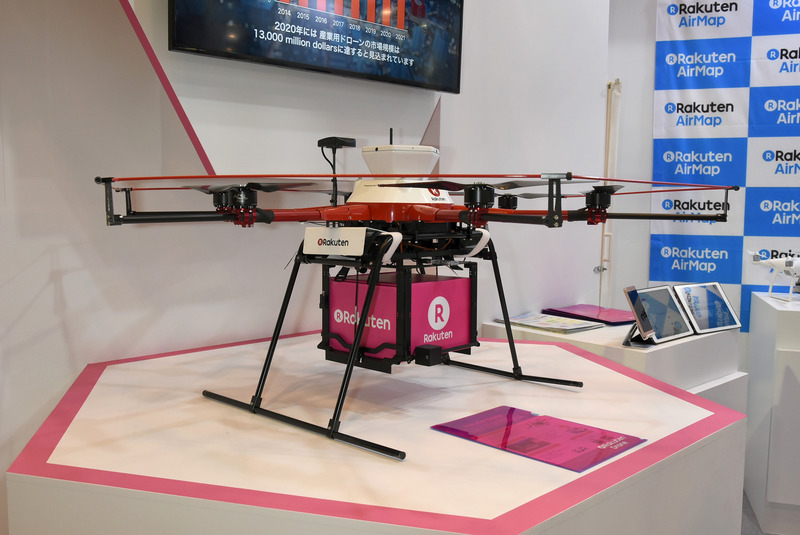 福島県南相馬市の配送サービスや千葉県御宿町のゴルフ場でのデリバリーサービスなど、将来のドローン物流を見据えた実験的サービスを精力的に行っている楽天ドローン。ブースではこうした商品の配送に使っているドローンと、それを管理するアプリを展示。また、昨年12月に提供を始めた空域管理ダッシュボードと、ドローンユーザー向けのアプリ「AirMap」のデモを行っていた。
