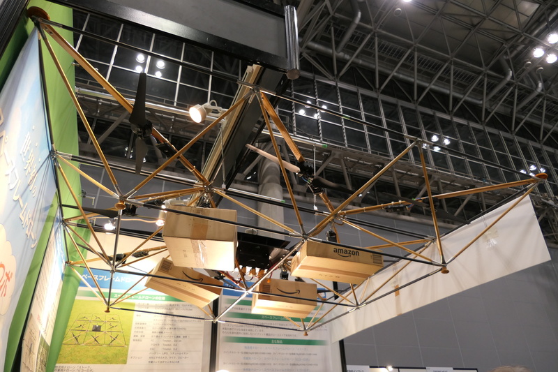 また、スペースフレームの文字通り、フレーム間に空間があるためそこにローターを配置すれば、フレーム自体がプロペラガードの代わりになるだけでなく、その空間に搬送する物資などを収めることもできる。また、このスペースフレームは構造材に軸方向の力しかかからないため、高価なカーボンパイプなどを使用しなくても、細い木製の丸棒やアルミパイプといった安価な材料でも十分な強度を保てるという。展示してあったドローンは一辺3mクラスのオクトコプターだが、より大きな機体も軽く作ることが可能。同社では2025年に大阪万博が開催される場合には、そのタイミングで人が複数乗れるドローンを披露したいという。