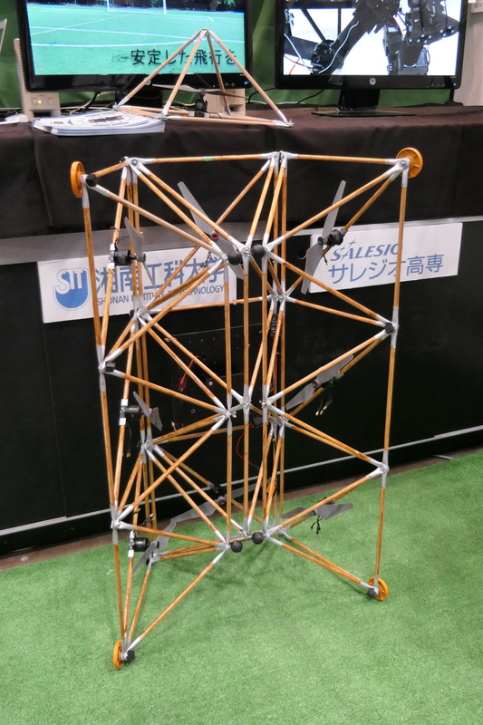 様々な建造物向けのスペースフレームの製造・販売を手掛けるテクノシステムは、同じ構造のスペースフレームを機体に採用したドローン「ヒコーロボ」を出展していた。このスペースフレームは棒状のフレーム部材を三角錐状に連続的に接続した立体トラス構造で、東京ビッグサイトのような大空間の屋根や宇宙ステーションのフレームなどにも採用されている構造だ。この構造をドローンの機体に採用することで、機体の強度を高められ、ひいては軽くてより大型の機体を作ることができるという。