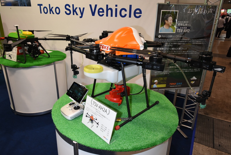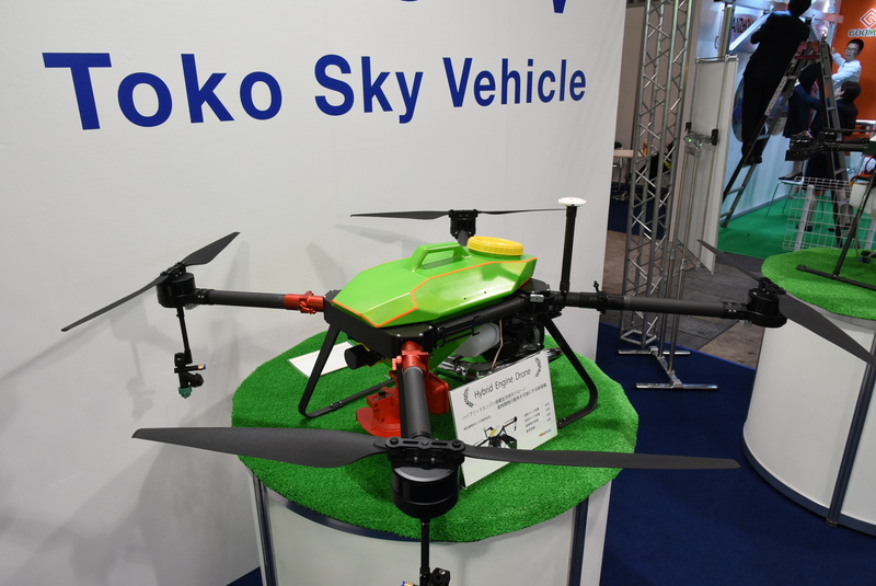 秋田に拠点を構える東光鉄工は、現在販売中であり地元秋田県を中心に約70機の販売実績がある農薬散布ドローン「TSV-AH2」に加えて、自動航行の認可を見据えた完全自動操縦モデル「TSV-AH2A」を披露。また、北海道のような広い圃場があるエリアに向けて、16リットルのタンクを搭載したドローン「TSV-AH3」と、エンジンによる発電によって長時間の飛行を可能にした「ハイブリッドエンジンドローン」を参考出品していた。