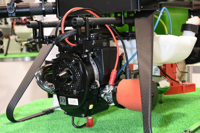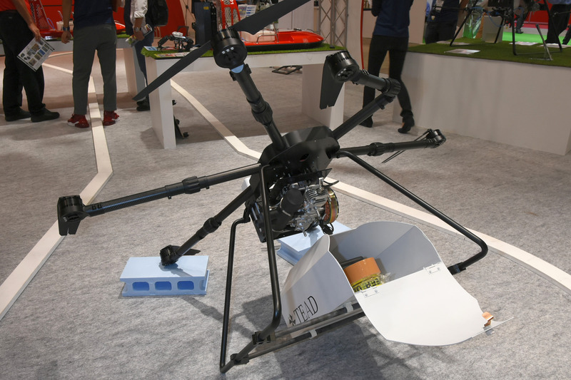 産業向け大型ドローンを手がけるTEDは、農薬散布用ドローンとしていち早く農林水産航空協会の認定を取得した「Mulsan DAX04」の自動飛行対応モデル「Mulsan DAX04 TypeT」を展示するほか、“長時間”“高ペイロード”をコンセプトに、エンジンを搭載した数々のハイブリッドドローンを提案していた。「Mulsan DAX04 TypeT」は、飛行精度を向上させるためにRTKを採用。圃場の脇に基地局を設置して飛行させることで、よりきめられたルートに対して精度の高い飛行が可能となる。