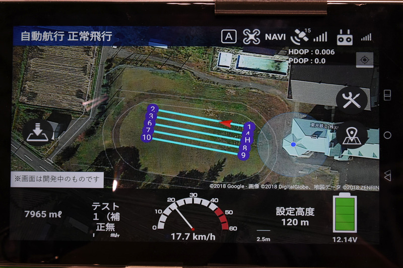 また説明員によるとこの移動局を使った方法の他に、MG-1P RTK専用のPhantomシリーズを使ったエリア設定方法を用意。エリア設定のために移動局を持って歩く代わりに、Phantomで上空からエリアの地図データを作成して、AGRASのプロポに取り込むことで、GNSS移動局アンテナを使った場合より広い範囲の地図を短時間で作ることができるというものだ。このPhantomシリーズというのは、先に発表されたPhantom 4 RTKを差している模様だ。MG-1P RTKの詳細はまだ決まっていないが、販売価格はおよそ250~260万円になるという。