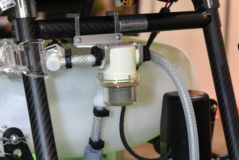 いち早く農林水産航空協会の農薬散布用ドローンの認定を取得したエンルートは、すでに400機以上の販売実績を持つ5リットルタンク搭載の「AC940」シリーズの最新型「AC940-D」と9リットルタンク搭載の「AC1500」を展示していた。いずれも、従来からあるモデルの継続販売ではあるが、実際にこれらのドローンを運用するユーザーからの要望を反映し、2019年モデルとして細かなアップデートを行っていることを訴求。また、興味深い所では粒剤散布装置が実際に稼働する様子をデモンストレーションしていた。