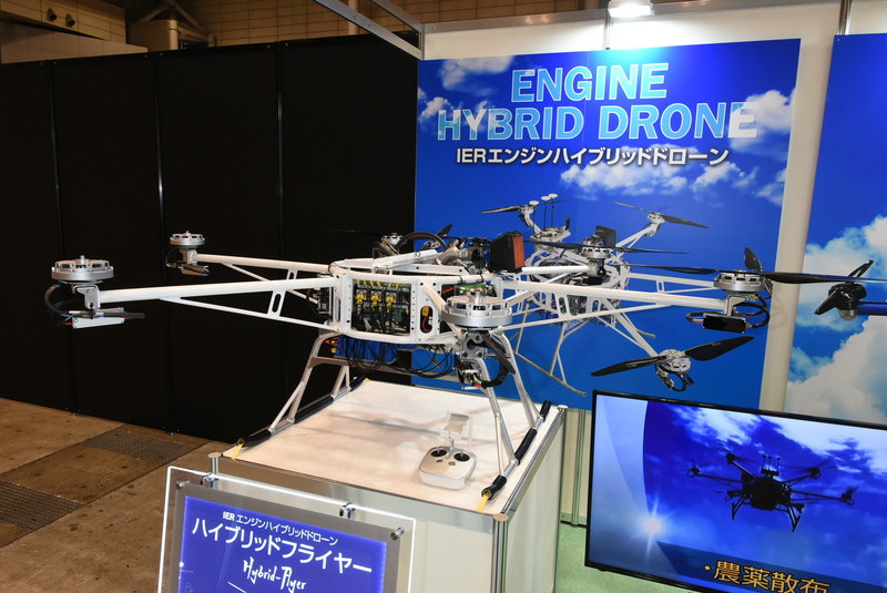 2019年発に発売を予定しているエンジンハイブリッドドローン「ハイブリッドフライヤー」は、発電用に4ストローク単気筒350ccエンジンを搭載し、4~5リットルのガソリンで最大12kgのペイロードを擁して1時間程度の飛行が可能。最長では180分以上の飛行が可能で、物資輸送や測量、撮影に供することができる。