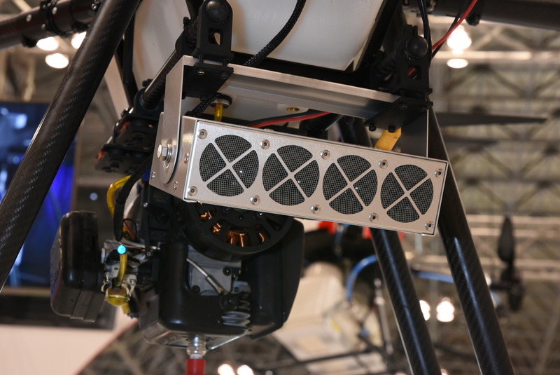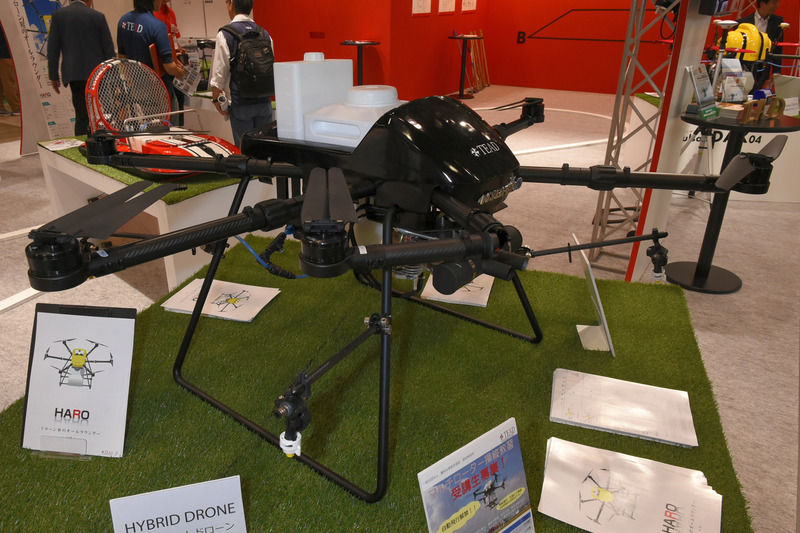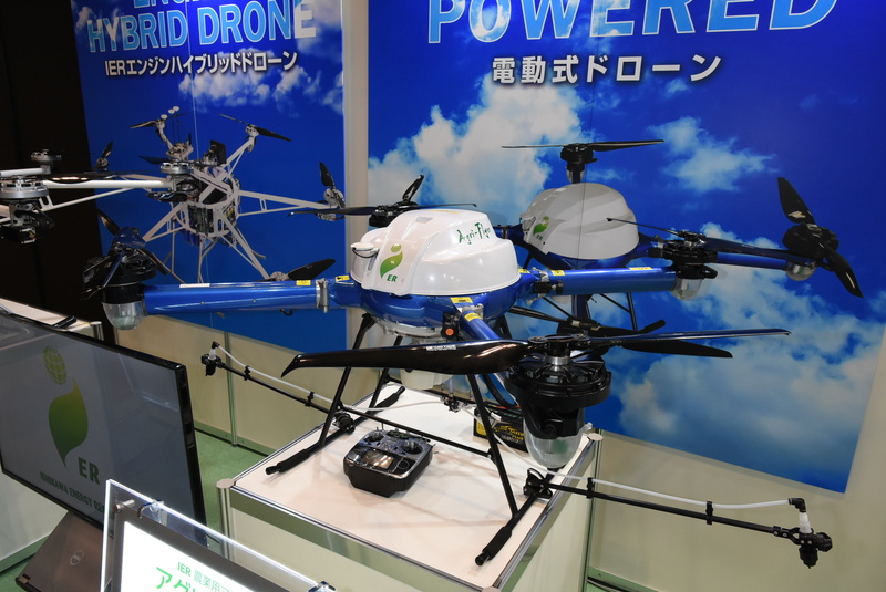 熱エネルギー機器を開発する石川エナジーリサーチは、農薬散布用ドローン、測量撮影用ドローン、エンジンハイブリッドドローンの3機を展示していた。いずれも大きな特徴はフレームの素材をマグネシウム合金としたことで、アルミより軽く、カーボンより高い強度を実現していることだ。