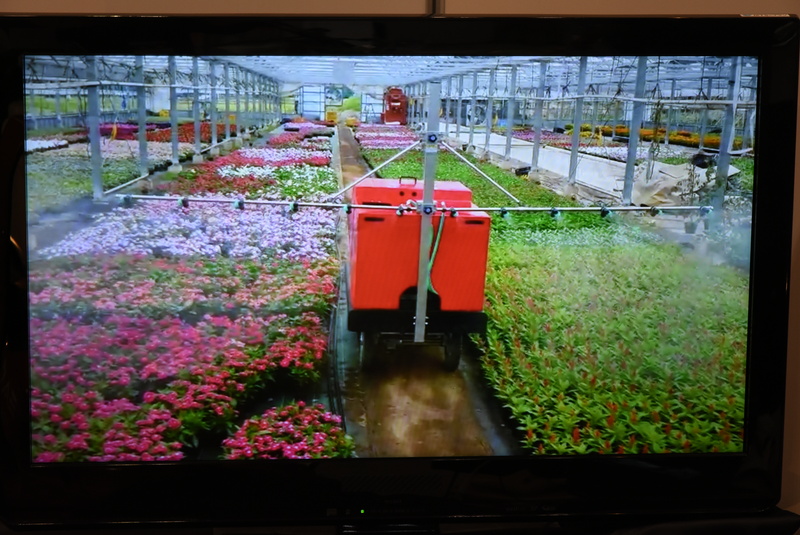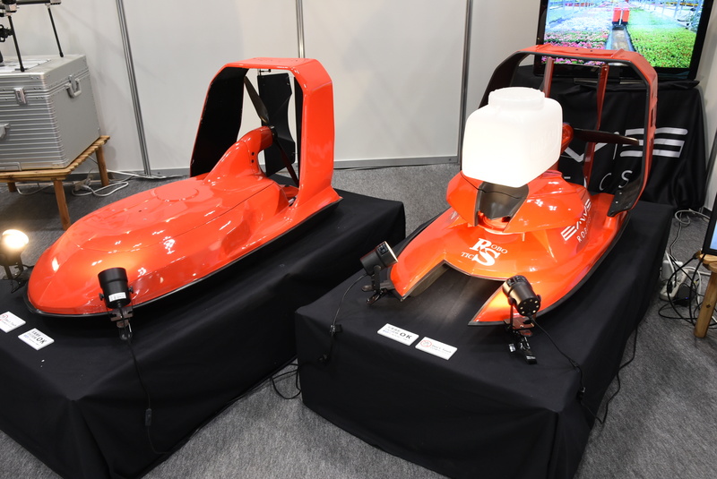 今年から新体制となったイームズラボは、水田を航行する無人ボート2機種を出展。いずれも赤と黒のカラーリングとスピード感あふれるデザインが特徴の機体で、ひとつはフロアブル液剤散布用、もうひとつは粒剤、豆粒散布用のモデルとなっている。さらにイームズラボでは、これまで培ってきたGUVの技術を生かした、ハウス内で液剤散布ができる無人散布車両の動画を公開。GNSSの位置情報によって決められたルートを走行しながら液剤を散布できるという。