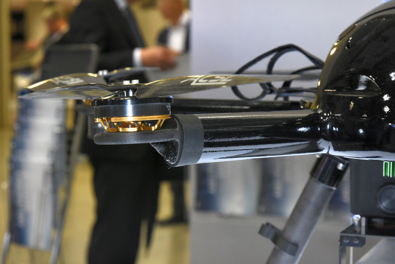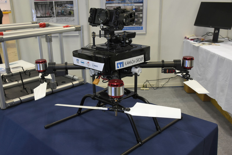 橋梁点検用ドローン「マルコ」。展示機は旧世代モデルだが、現在はより高精細のカメラを搭載し、従来4K動画だった撮影を静止画にして高画素化することで、より長い離隔で飛行することを実現している。