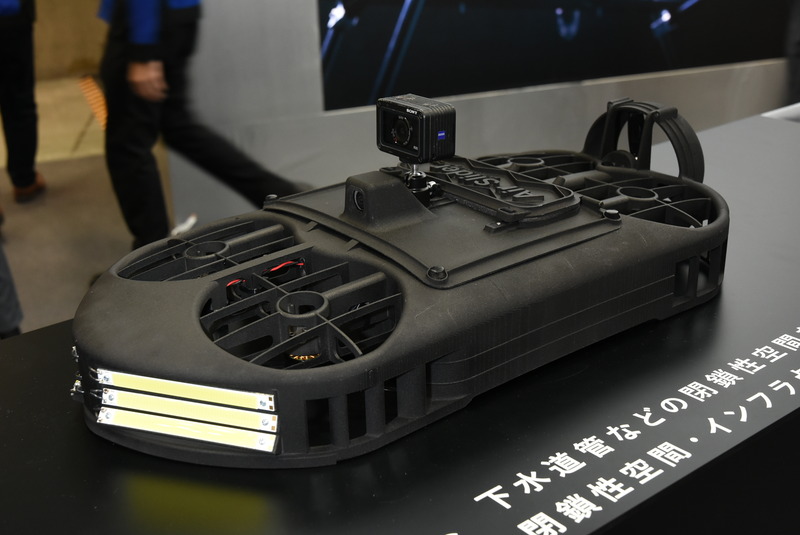 もうひとつの動態展示は、ブース内を横切るように設置されたセット。これはACSLが水道コンサルタントのNJSと共同で開発している管路・閉鎖性空間点検用ドローン「AS400」のフライトブースだ。AS400は管径400mm以上の管路を4つのローターによる浮力でホバークラフトのように浮いて進みながら、管路の内側の撮影を行う。操縦はタブレットによって行い、機体後部に付けたワイヤーを巻き戻す形で管路の先に到達した機体を回収する。