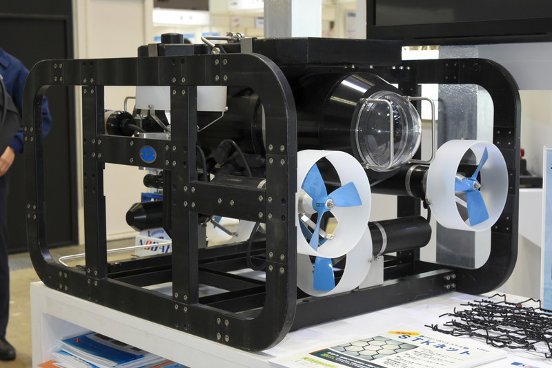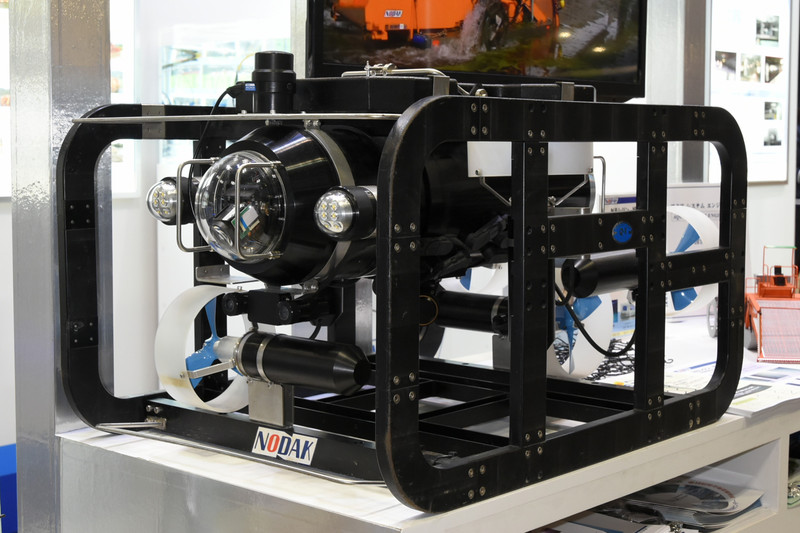 飛島建設グループのノダックは光ネットワーク伝送式水中テレビロボット「DELTA-200.net」を出展していた。このROVはQI(キューアイ)の製品で、映像伝送に光ネットワークを採用することで、信号減衰などの問題でこれまで難しかった深海や長距離の調査を可能としたものだ。水深200m、ケーブル延長500mまでの作業が可能で、120万画素3倍ズームカメラでハイビジョン画質の映像を撮影できる。