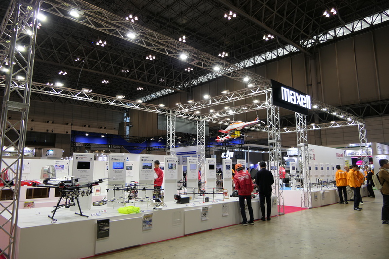 マクセルのバッテリーを採用した日本国内のドローンをずらりと展示した同社のブース。
