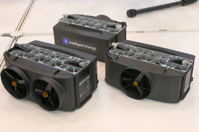 英国のIntelligent Energy社は、ドローン用燃料電池セルを出展していた。同社は自動車用や定置用電源、ドローンといった用途に燃料電池を開発しており、2006年からはスズキと燃料電池スクーターの共同開発を行っており、2017年には公道走行を実現している。今回出展したドローン用燃料電池は650Wものが790g、800Wのものが880gと極めて小型軽量な燃料電池セルとなっている。燃料電池の燃料となる水素は高圧タンクから供給され、今回展示した約4.7lのタンクには約300気圧をかけて充填することで、約70分程度の飛行が可能となっている。