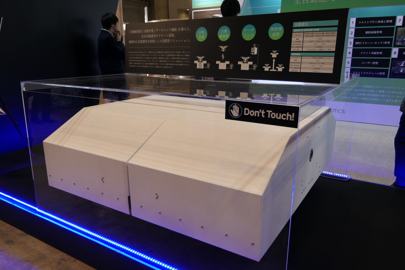 センシンロボティクスでは近年、全自動ドローン運用サービス「DRONEBOX」を展開してきたが、今回のJapan Drone 2019では、新たに自社で開発した「SENSYN DRONE HUB」を公開した。これはドローンの機体、自動離発着や充電を行う基地、そして制御ソフトウエアと業務アプリケーションが一体となったもので、大規模な工場の警備監視や定期的な設備点検といった用途に向けて開発されたソリューションだ。