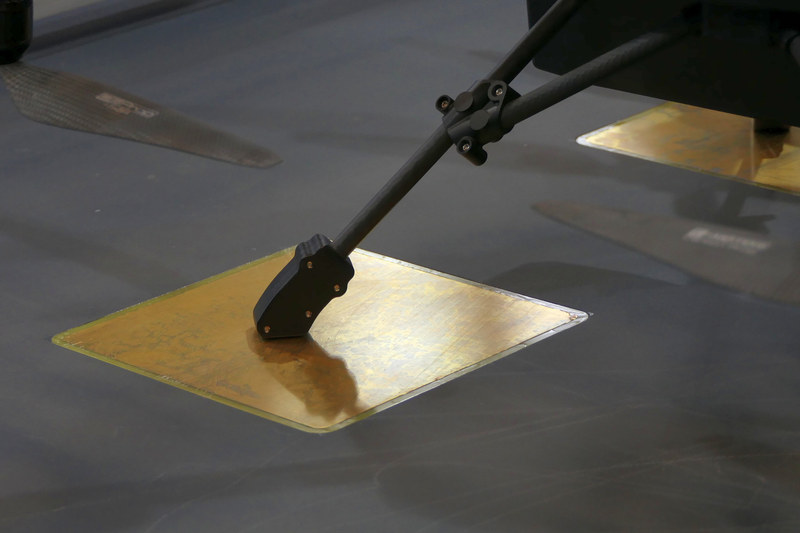独自に開発した専用のクワッドコプター。着陸時は基地の端子から脚部を通じて充電が可能としている。