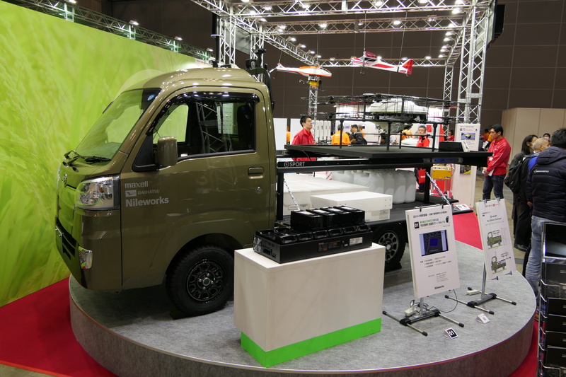 さらにこのバッテリーの展示に合わせて、ナイルワークス、ダイハツと共同で農業用ドローンの新しい形を提案。ダイハツの軽トラック「ハイゼット」にNile-T18と予備バッテリー等を搭載したこのパッケージは、RTK-GPSによって軽トラックの荷台に設けたヘリポートから直接離着陸ができる。これにより農業用ドローンを運用するうえで作業者の負担となる機体の積み下ろしを省くことを実現した。