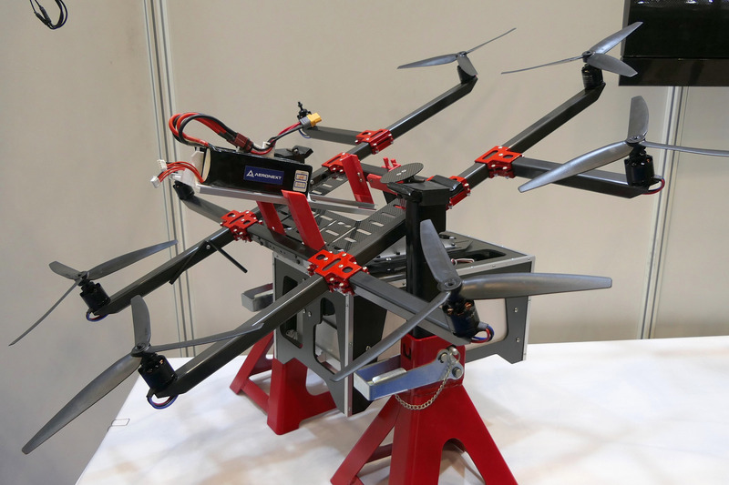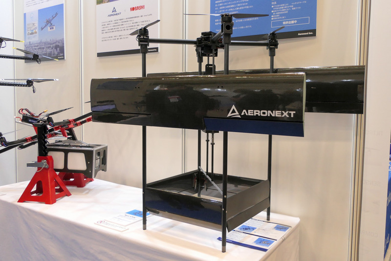 エアロネクストは独自で開発し特許も取得している重心制御技術「4D Gravity」を駆使した独創的なドローン開発を行っている。そんな同社のブースで来場者の目を引いていたのがカーボン製の翼を持つVTOL機だ。「Next VTOL」と名付けられたこのVTOL機は2枚の主翼と4枚の尾翼を備え、4つのローターが離着陸時の上昇下降と、水平飛行時の推進力を生み出す。
