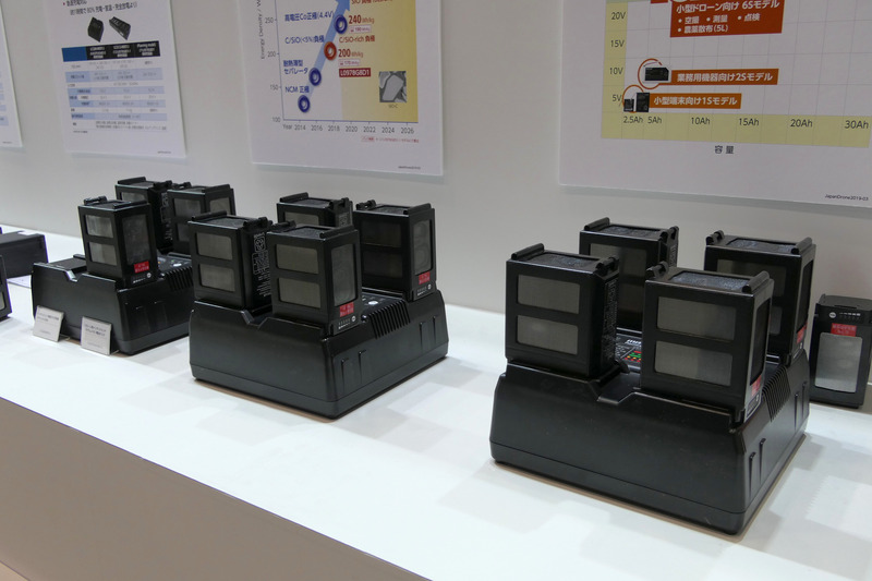 現在、ドローン用のバッテリーとして展開しているインテリジェントリチウムイオン電池パックと4チャンネル対応充電器。角型缶のリチウムイオンバッテリーの中ではドローン用として高出力を実現している。