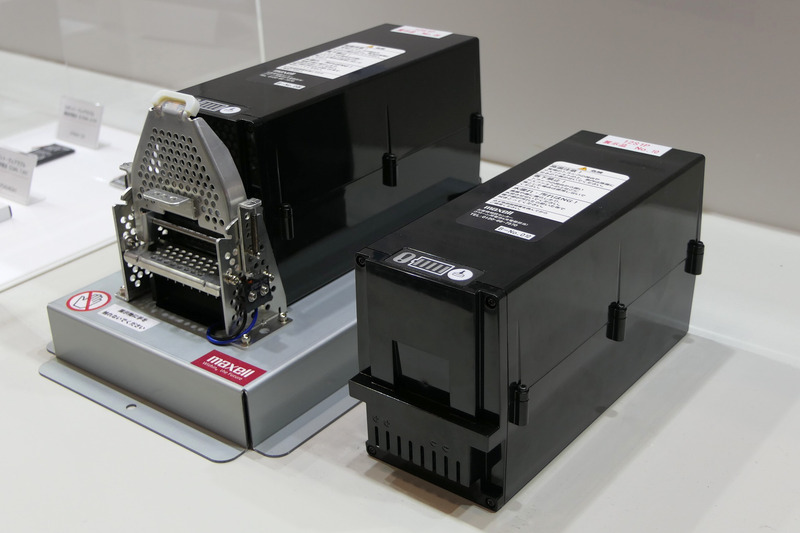 ドローン用バッテリーを開発・製造するマクセルは、前回に続いてドローン用インテリジェントリチウムイオン電池パックを展示。同社のこのバッテリーは高出力の角型リチウムイオン電池を使用した127Whの電池パックで、日本国内のドローンメーカーの多くに採用されている。今回の出展では新たにナイルワークスが2019年度から本格的に販売を開始する農業用ドローン「Nile-T18」用のバッテリーを公開した。