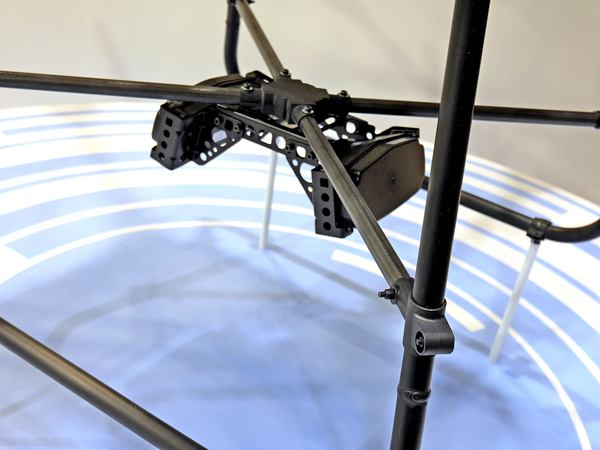 産業用マルチローター機YMRシリーズの新機種となるYMR-IIは、6枚のローターを配したヘキサコプターだ。アルミとカーボンの強化樹脂によるボックスフレーム構造の採用などにより高い飛行安定性を実現している。従来機と比べローターの数を8枚から6枚、バッテリーを2個から1個に変更し、シンプルな構造に見直された。また、ローターを折りたたんだ収納時のサイズは733×626×786mmと、同社従来モデルとの体積比で約1/2の縮小を実現させた。