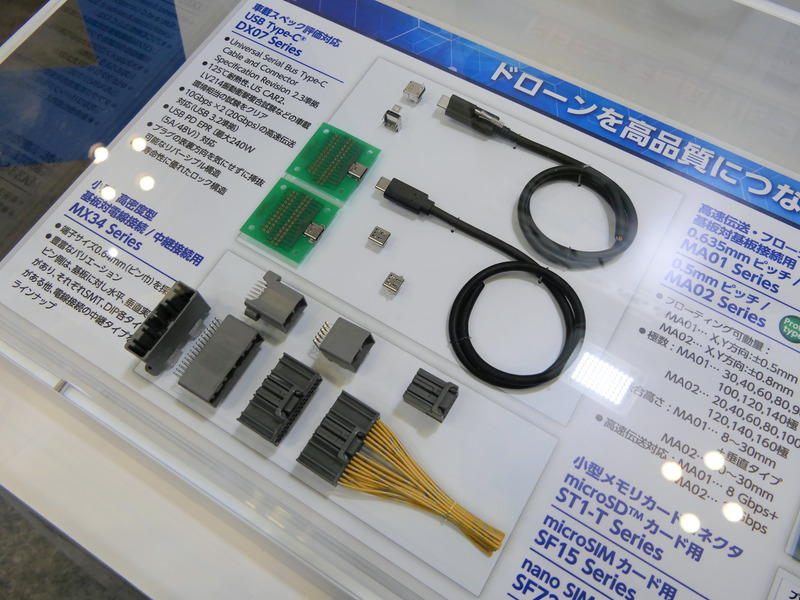 日本の最大手コネクタメーカーであるJAEは、もともと航空機用電子機器向けのコネクタを作っており、信頼性の高い製品を世に送り出している。近年は自動車向け、携帯機器向けの製品が主力となっており、その中でも振動をはじめとした厳しい環境下で使用される自動車向け製品を、“ドローンを高品質につなげるコネクタ”として展示していた。