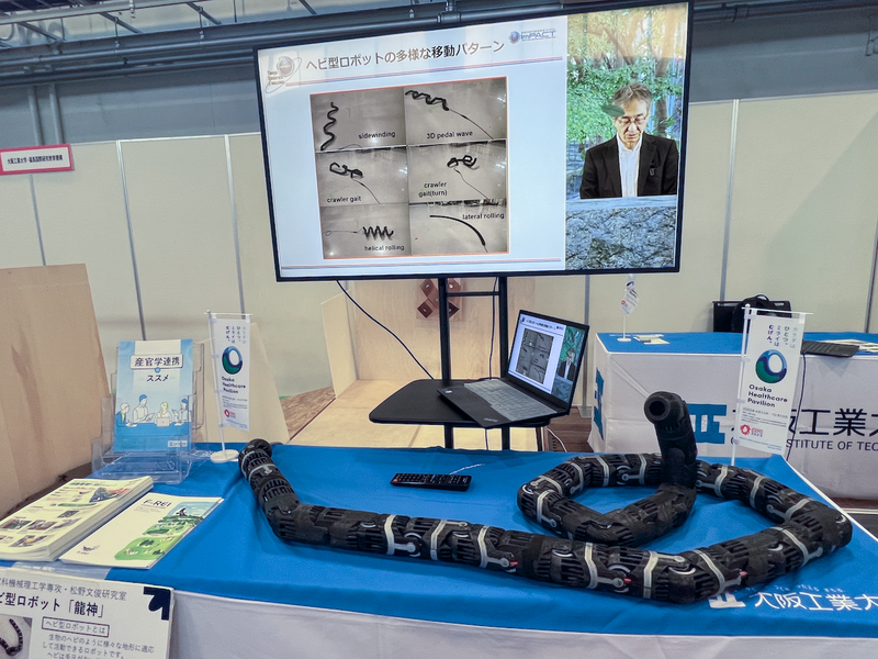 神戸大学は、遠隔操作によるロボットアームとハンドの操作体験を紹介。過酷環境下での危険物除去を想定した体験が可能だった。大阪工業大学は、狭い場所や倒壊建物内で活躍するヘビ型ロボットを展示していた。