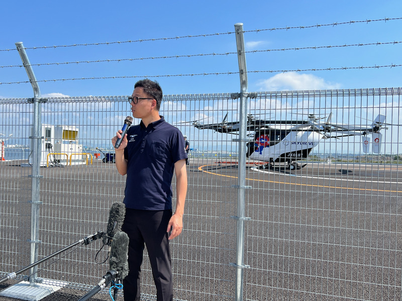 当日は、SkyDriveの福澤氏が報道陣のインタビューに応じた。「機体の開発を行っている山口県での飛行試験と比べ、大阪は気温が高いうえ海風の影響もあり、そうした条件下でも安定した飛行ができたのは大きな成果だった」と語る。