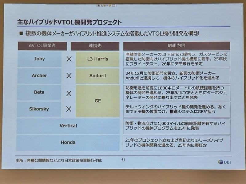 空飛ぶクルマの開発を巡っては、「電動化」と「自動化」を最大の特長とし、ハイブリッド型eVTOLの開発プロジェクトが複数進行しているという。さらに、空飛ぶクルマの開発企業と自動車メーカーによる連携の動きも出てきている。