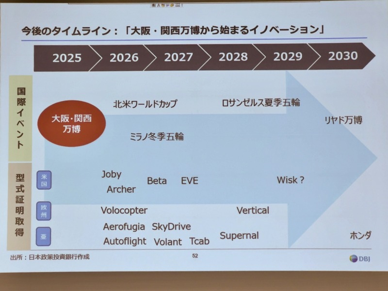 社会実装に向けた計画は遅れているが、大阪・関西万博を機にイノベーションが始まり、今後も開催予定の国際イベントが後押しするとしている。並行して2026年から30年にかけて複数の機体メーカーが型式証明を取得し、その後いよいよ本格的な商用化が始まる。