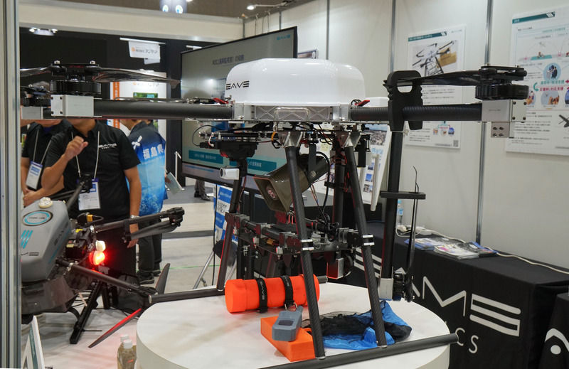 会場では物流向けの新型機「E600-100」も展示された。E600-100は6枚のプロペラを備えたヘキサコプター型ドローンで、全長・全幅とも約2m、機体重量19.9kg。最大5kgの荷物を積載し、約20分間の飛行が可能だ。都市部でのレベル4飛行を見据え、第一種型式認証を申請中で、今年度内の取得を目指している。