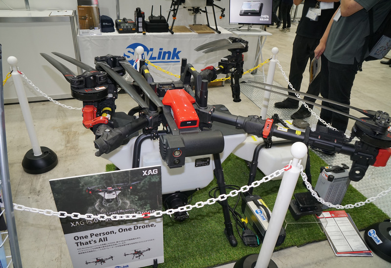 同社ブースでは、中国の農業ドローンメーカーであるXAGの最新型ドローン「P60」も展示された。機体寸法は縦2517mm×横2575mm、最大離陸重量は67.5kg(液剤装置装着時)。モーターアームを折りたたむことで機体サイズを約20%縮小できるコンパクト設計となっており、輸送や保管の利便性が高められている。