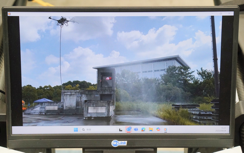写真:ドローンが空中から放水する様子を映したモニター