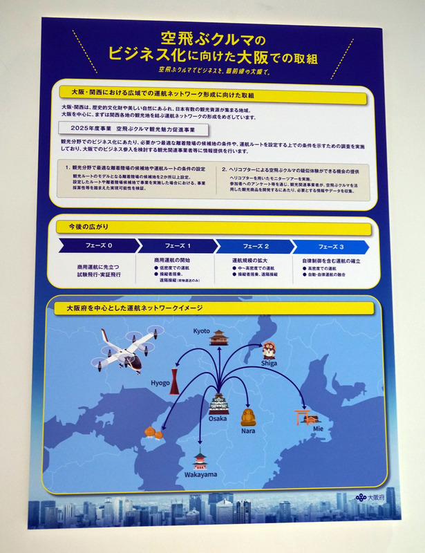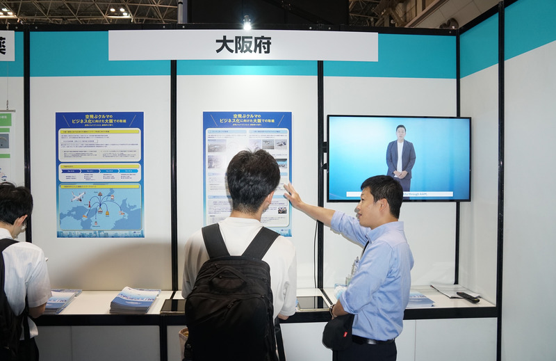 大阪府の展示ブースでは、これまでの取り組みをまとめたパネル展示や映像資料を通じ、「空飛ぶクルマ先進地・大阪」を力強くアピール。多くの来場者がブースの前で足を止め、パネル展示に見入ったり、大阪府のこれまでの空飛ぶクルマへの取り組みをまとめたパンフレットを受け取るなど、高い関心を示していた。
