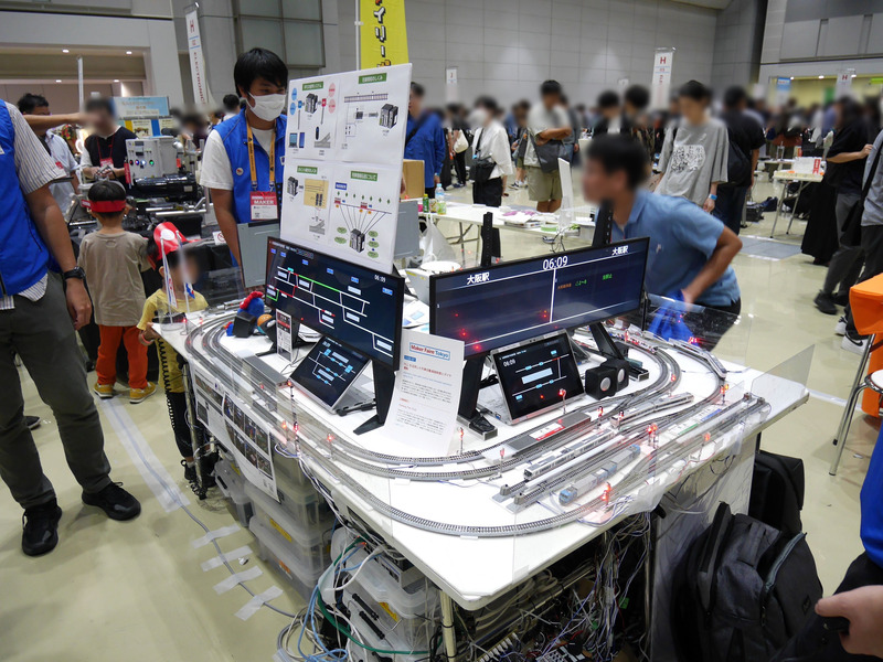 Railway Fan Clubの「PLCを活用した列車自動進路制御とダイヤ運転」の展示。鉄道模型(Nゲージ)を用いて、JR西日本の大阪環状の列車運行を実物同様に再現したもので、信号機の制御は、工作機器を自動制御するための専用コンピューター(PLC)を活用し独自に開発したシステムを用いている。入力したダイヤグラムで定められた時刻通りに運行し、駅の案内表示や発車メロディも実物同様に動作する。机の下の配線が凄い!
