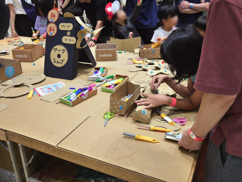 ダンボールを素材に、様々な造形&デザイン&プロダクトを独自手法で作り続ける複数の作り手が集まり、それぞれがワークショップを開催したのはmake道場。子どもたちは、ダンボールに色を塗ったりその他の素材を組み合わせたりし、作り上げていく。
