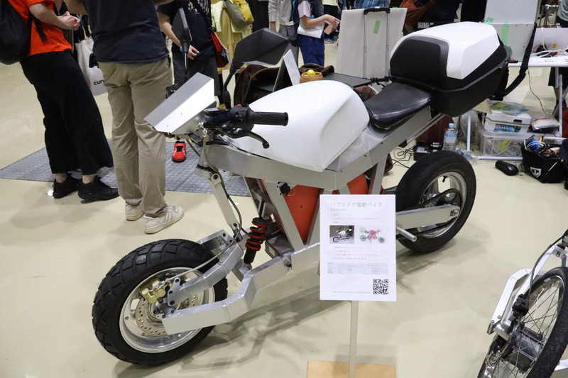 前田武志氏の「ハブステア電動バイク」。市販車の改造ではなくフルスクラッチ。ハブステア機構やフレームも全て自作とのこと。設計は3DCAD、切削はCNCフライス、フレームはアルミ溶接で作っている。