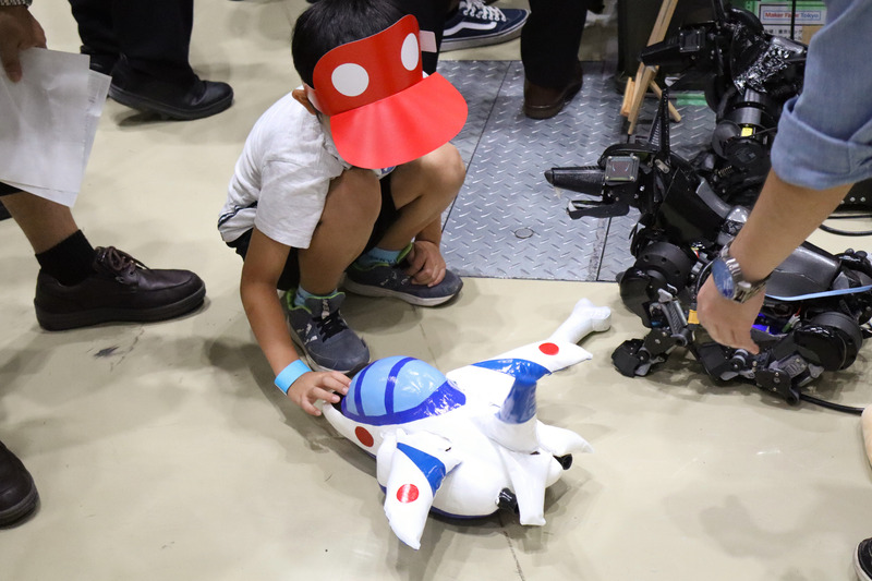 つくる~む海老名のブースで見つけたのは三角コーンに擬態するヤドカリロボット。持ち上げる、移動する、引っ込むの3つの動作が可能で、操縦はスマートフォンで行う。かわいらしい動きで足を止める人が多数いた。