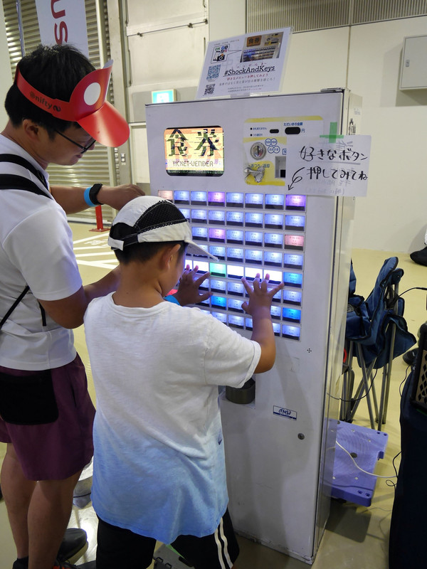 うこの「食券機型電子楽器 “ShockAndKeys”」の展示。そば屋やラーメン屋、学校の食堂などで見かける「食券機」を魔改造して電子楽器にしてしまったとのこと。普段押しまくることのない食券機ボタンを思う存分いろいろ押すことで音が奏でられる。子どもが楽しそうに押しまくっていた。