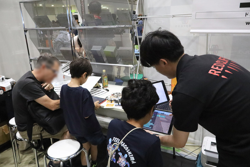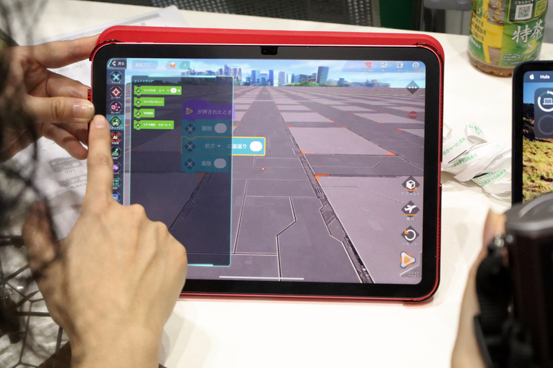 スポンサーゾーンでは弊誌ドローンジャーナルのブースにて、大阪・関西万博をはじめ、全国各地で数多くのドローンショーを手掛けるレッドクリフによるデモンストレーションと、小型教育用ドローン「Hula(フラ)」を使ったドローンプログラミングの体験を子ども向けに行った。タブレットやPCを使って、アイコンや絵など視覚的なオブジェクトを組み合わせるブロックプログラミングとなっているので、子どもでも簡単に離陸・飛行・着陸を制御することができる。自分のプログラミング通りにドローンが動く楽しさを体験できるというもの。このHulaは、複雑なプログラミングも可能なので、最初は簡単な制御から、どんどん複雑なものに挑戦していくことができるそうだ。