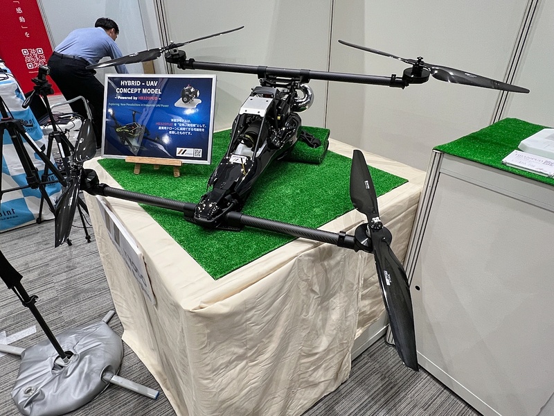 会場では、この「HB320PUD」を“空飛ぶ発電機”として産業用ドローンに搭載したハイブリッドドローンの試験機が展示された。現在は試験段階にあるため、機体側の詳細なスペックは非公開だが、エンジンによる安定した電力供給を前提とした新たな運用の可能性を感じさせる内容となっていた。