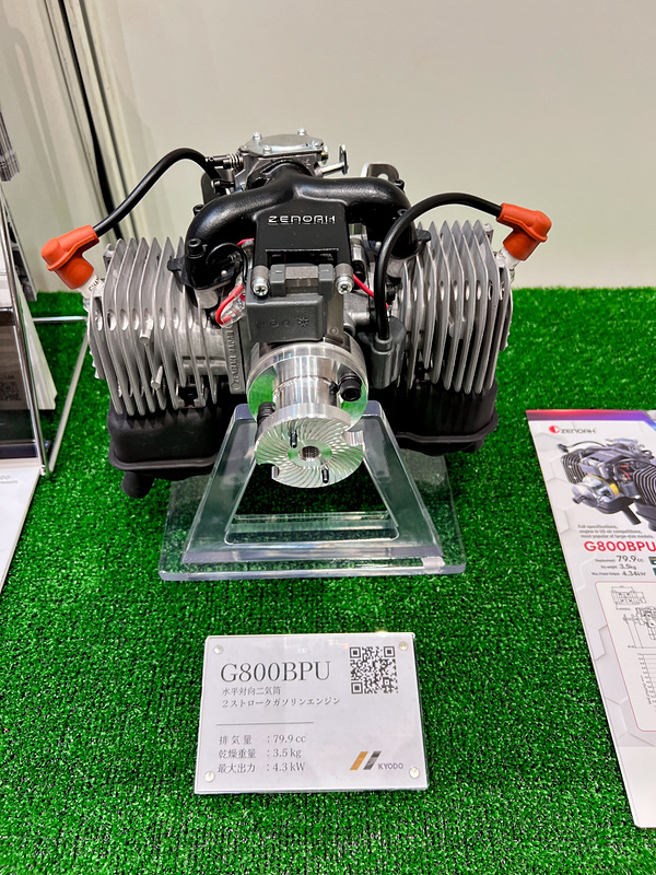 さらに、現在開発を進めているのが、水平対向二気筒の2ストロークエンジンである「G800BPU」だ。排気量は80cc、最大出力は4.3kW。乾燥重量は11.9kgで、燃料込みの最大ペイロードは13kg、燃料タンク容量は4L、最大離陸重量は24.9kgとされている。エンジン直結の可変ピッチプロペラシステムを採用している点が特長で、飛行性能の向上を狙う。