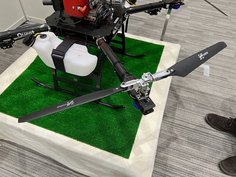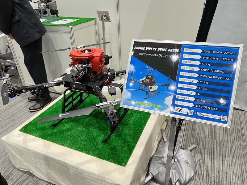 クエストコーポレーションは、チェーンソーや芝刈り機で知られるゼノア(ハスクバーナ・ゼノア)から事業譲受された協同社製ホビーエンジン「G800BPU」を搭載したドローン「QMQ1100VP-G」も公開した。