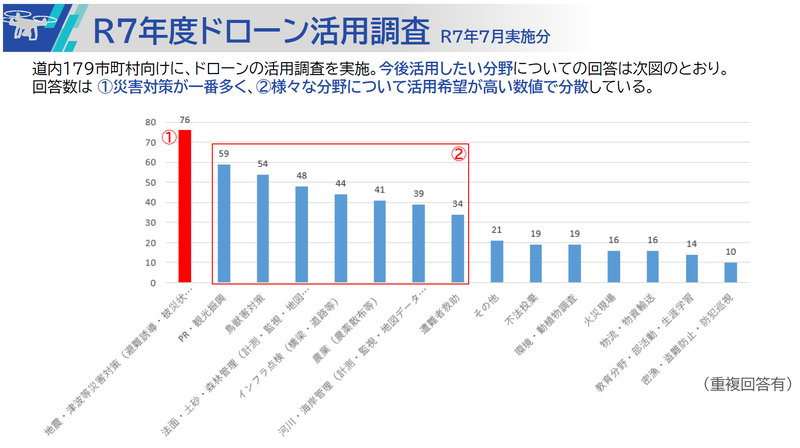 道庁では2022年度から「ドローンフィールド北海道」として、ドローン利活用推進を進めており、その取り組みが全国知事会の先進政策バンクにおける令和7(2025)年度「優秀政策」に選定されたことが報告された。