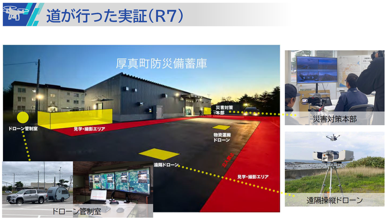 また、2025年度の新たな実証として、2025年11月17日に厚真町をフィールドとして「災害時における遠隔操縦ドローンの多数機同時運航実証」を実施したと報告。民間企業等が設置したドローンポートを連携協定に基づいて災害時に活用するというシナリオで、複数機を遠隔操縦して広範囲の被災状況把握や避難誘導を行う仕組みを検証した。