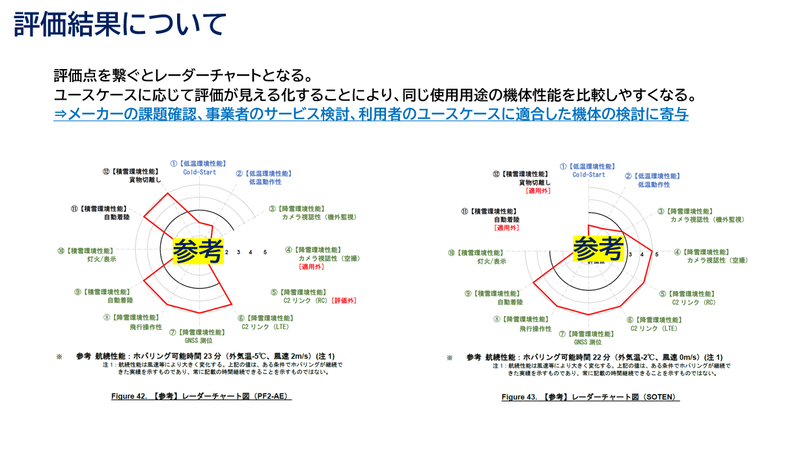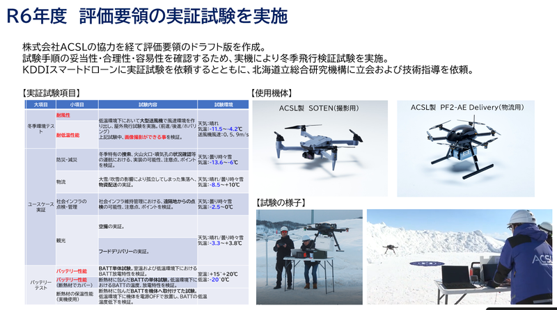 さらに、ACSLの佐々木大介氏からは、新十津川町で策定した寒冷地性能試験評価要領について説明があった。低温、降雪、積雪の3分野で試験項目を整理し、用途に応じた部分評価も可能とすることで、寒冷地での導入や開発を促進する狙いだという。「実際に降雪環境でカメラの視認性や通信距離を確認する試験を実施した。試験結果をレーダーチャートで可視化することで、一目で比較することができる」と活用方法を示し、ユーザーへの説明や比較にも活用できる点を強調した。