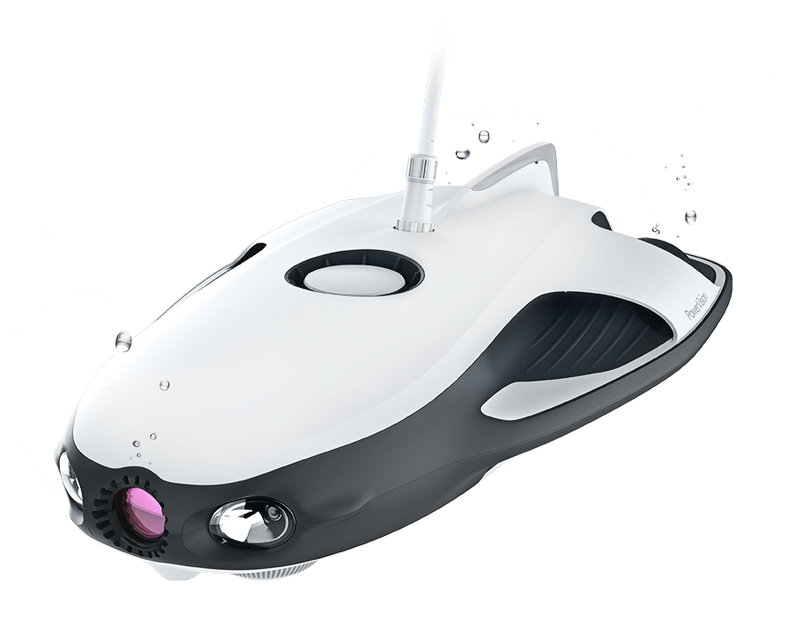 販売する水中ドローンは「PowerRay」というもの。本体と操縦器を50~70mのケーブルでつないで陸地や水上から操作する。最大で深さ30mの水中で行動可能で、水中撮影向けカメラや魚群探知機を標準で搭載する。水中の構造物の様子を画像で確認したり、探知機で魚群を探し出すことが可能だ。