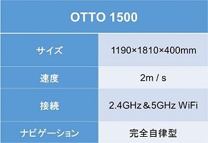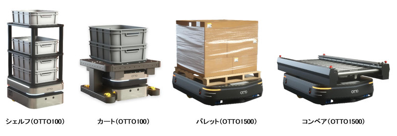 OTTOシリーズには「OTTO100」(最大積載量100kg)と「OTTO1500」(最大積載量1,500kg)の2種類がある。小型搬送用の「OTTO100」にはシェルフやカート、大型搬送用の「OTTO1500」にはパレットやコンベアを連結させることでさまざまな場面で活用することができる。